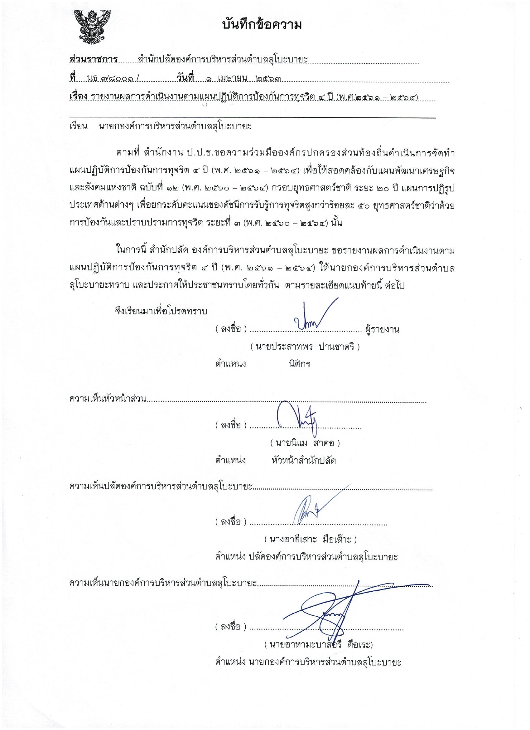 รายงานผลการดำเนินงานตามแผนปฏิบัติการป้องกันการทุจริต 4 ปี พ.ศ.2561-2564