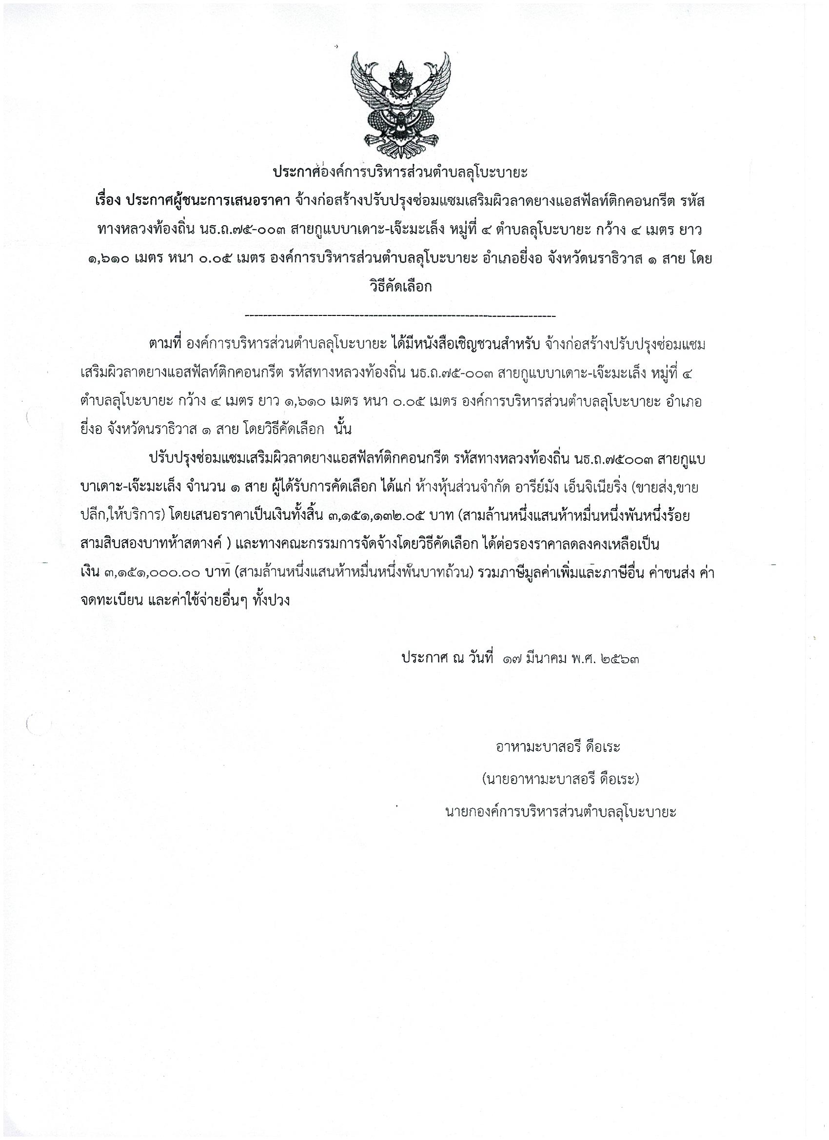 ประกาศผู้ชนะการเสนอราคา จ้างก่อสร้างปรับปรุงซ่อมแซมเสริมผิวลาดยางแอสฟังท์ติกคอนกรีต สายกูแบบาเดาะ-เจ๊ะมะเล็ง หมู่4